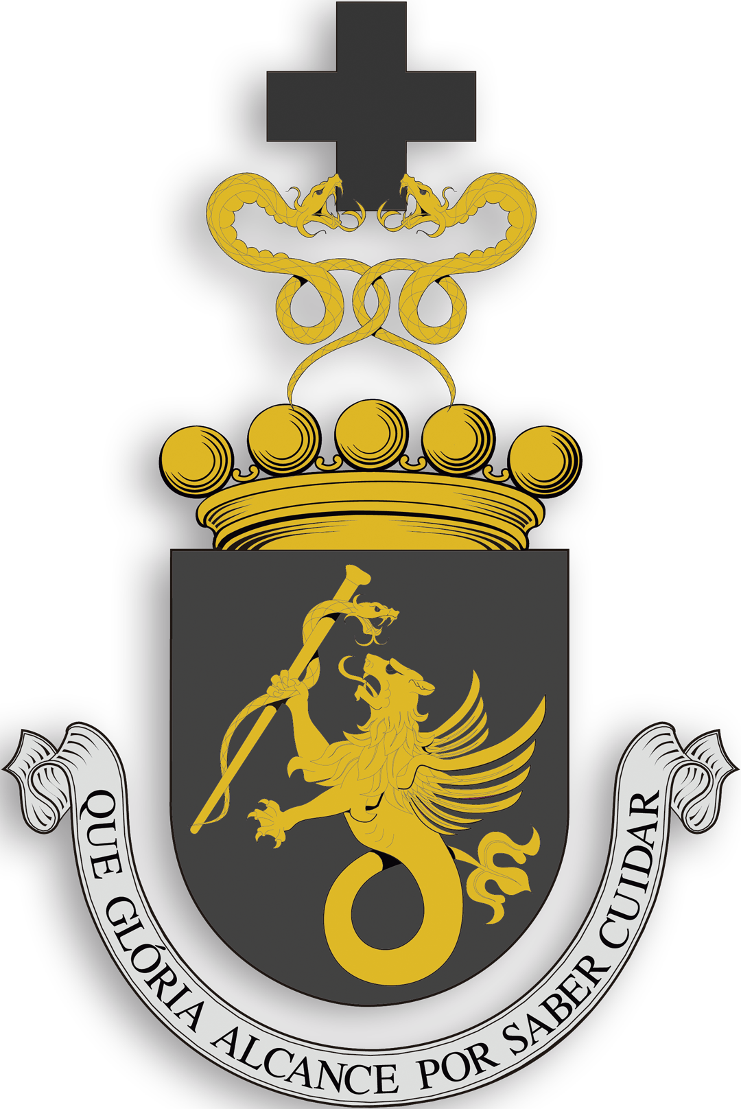 De púrpura, um leão-marinho alado, de ouro, animado de vermelho, segurando na garra dextra o bastão de Esculápio de ouro, sendo a serpente de ouro animada de vermelho