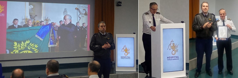O final da sessão ficou ainda marcado por um agradecimento público ao Contra-Almirante Francisco Gamito Guerreiro, pelo trabalho desenvolvido enquanto Diretor do HFAR (22DEZ21 a 10JAN25), tendo sido entregue pelo Diretor do HFAR uma lembrança institucional alusiva a este hospital.